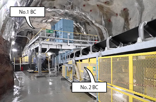 №1ベルトコンベアと№2ベルトコンベア(約4km)の乗継部